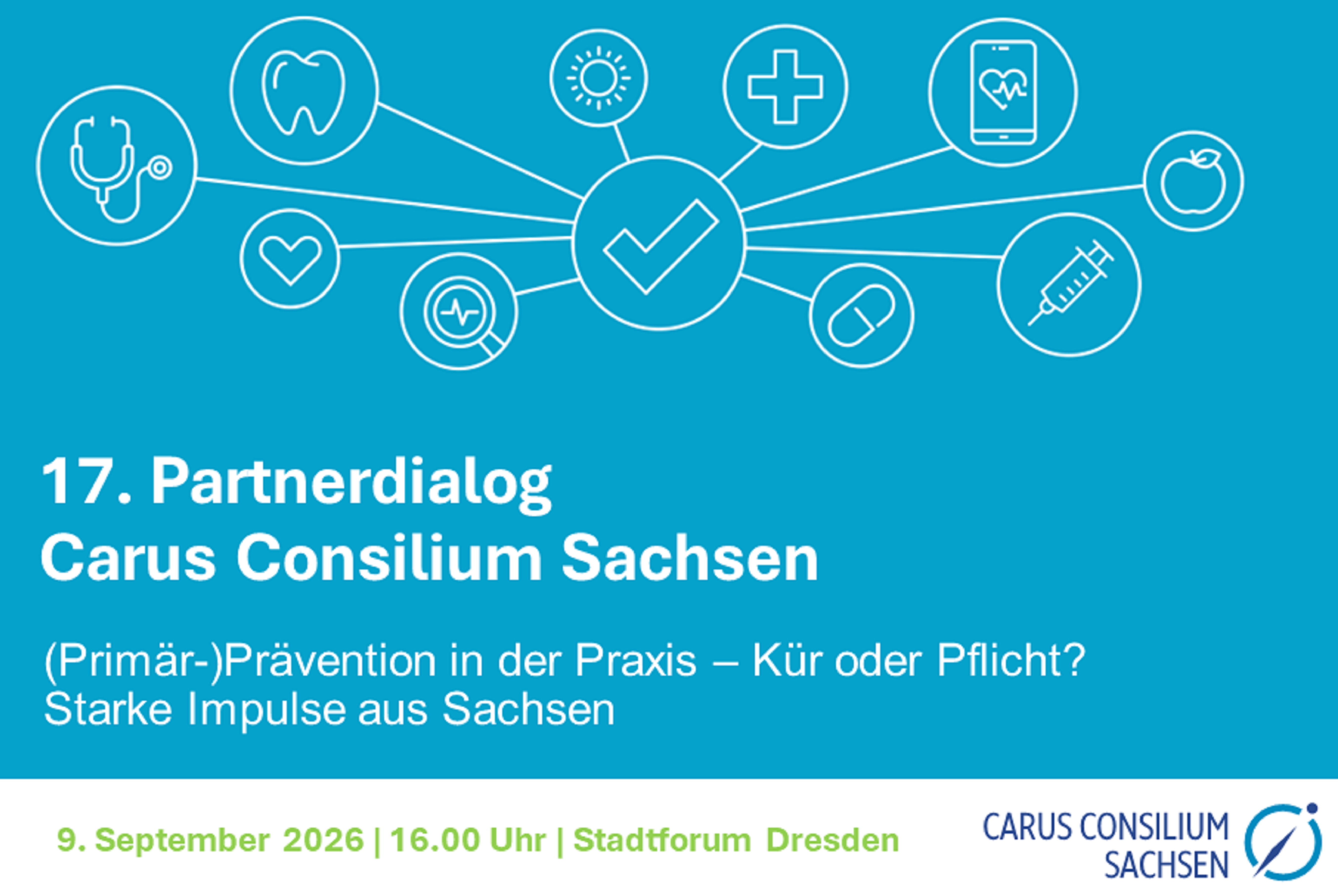 Wir laden Sie herzlich zum 17. Partnerdialog Carus Consilium Sachsen ein. Das Netzwerktreffen steht in diesem Jahr unter dem Motto „(Primär-)Prävention in der Praxis - Kür oder Pflicht? Starke Impulse aus Sachsen“ und findet am Mittwoch, den 9. September 2026, in Dresden statt.